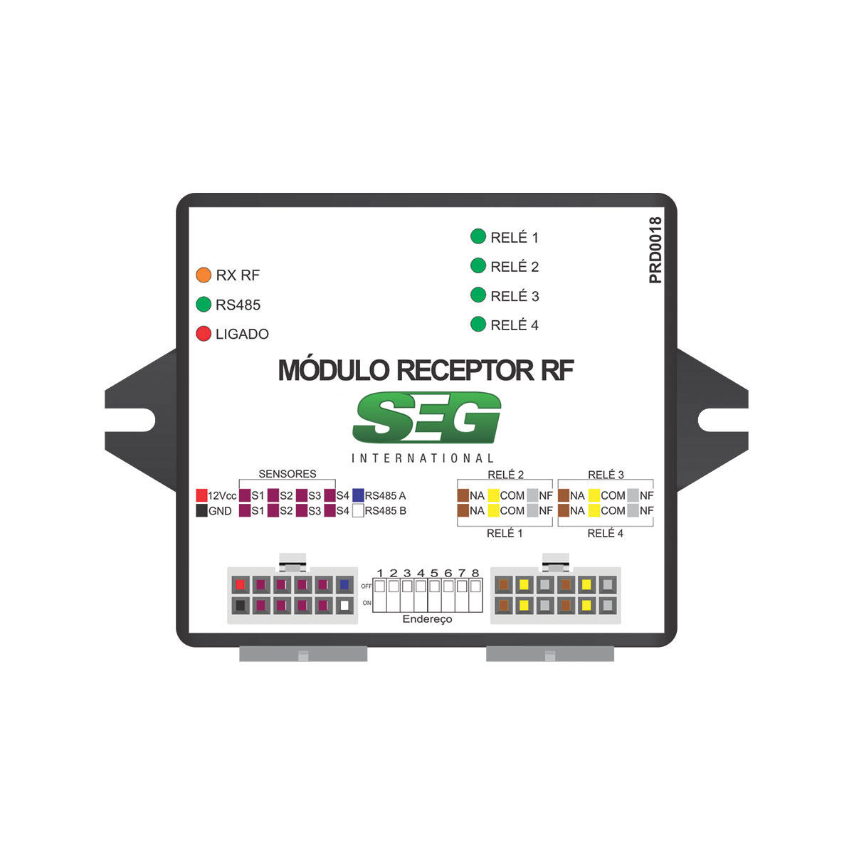 El Módulo Receptor RF (PRD0018) es la interfaz ideal para controlar portones de garaje. Permite el control de hasta 4 portones y intertrabamiento (esclusas) para vehículos. Con criptografía en la lectura de la señal de RF, identifica el usuario e informa al Módulo Acceso vía red RS485.